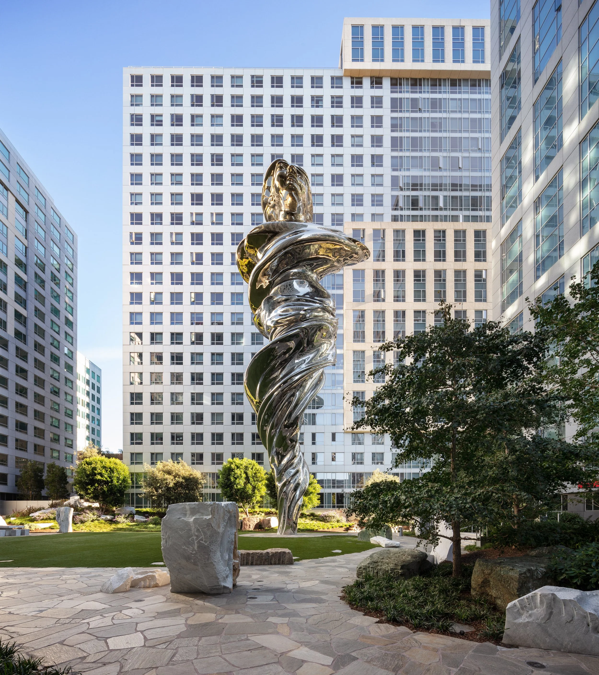 Piazza Angelo: A one-acre public courtyard and art space in the center of the complex. It features Venus, a 92-foot-tall stainless steel statue that is the tallest sculpture in San Francisco.